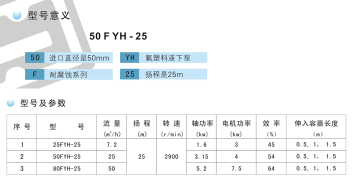 FYH氟塑料液下泵 產(chǎn)品綜述: 25FYH-25 50FYH-25 80FYH-25 產(chǎn)品用途 本產(chǎn)品廣泛適用于輸送酸堿、有機溶劑、強氧化劑等腐蝕性介質。 使用溫度:-20度~85度。 設計特點 FYH型氟塑料液下泵是長軸式立式離心泵,其接觸液體部分全部由氟塑料合制而成,具有耐腐蝕范圍廣、效率高、重量輕、不需要灌液即能抽送、維修方便等特點。